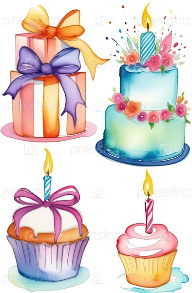 Пастельная башня для подарков на день рождения с тортом и лентами, иллюстрация акварельной вечеринки, веселый вертикальный дизайн