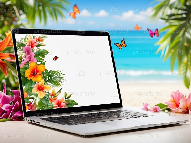 Открытый ноутбук с видом на океан, концепция летнего офиса, цветы гибискуса, пальма, большой пустой экран для удаленного текста проекта, объявления или макета
