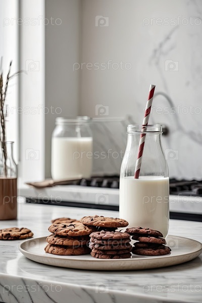 Шоколадные печенье и холодное молоко в стеклянной бутылке, выбор здорового молочного и немолочного молока, завтрак или закуска