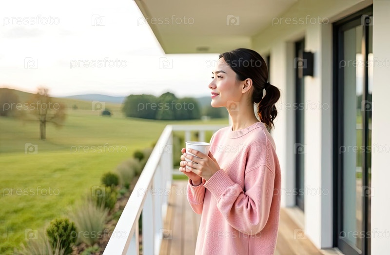 Азиатская женщина наслаждается весенним балконным утром с кофе, отдыхая рядом со зеленым садом в своем современном доме
