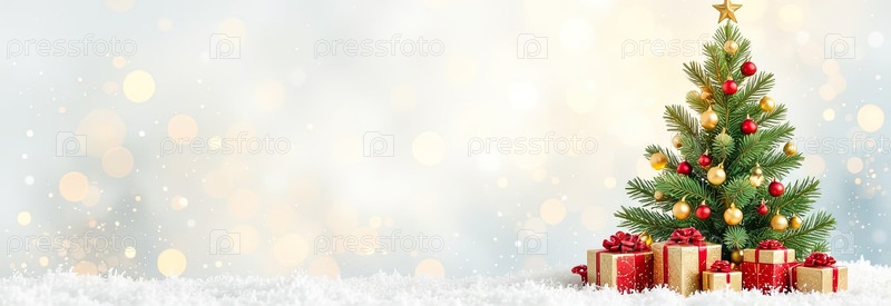 Акварельная зеленая рождественская елка и коробки для подарков на сияющем фоне. поздравительные открытки на Рождество и Новый год с копировальным пространством. созданный ИИ