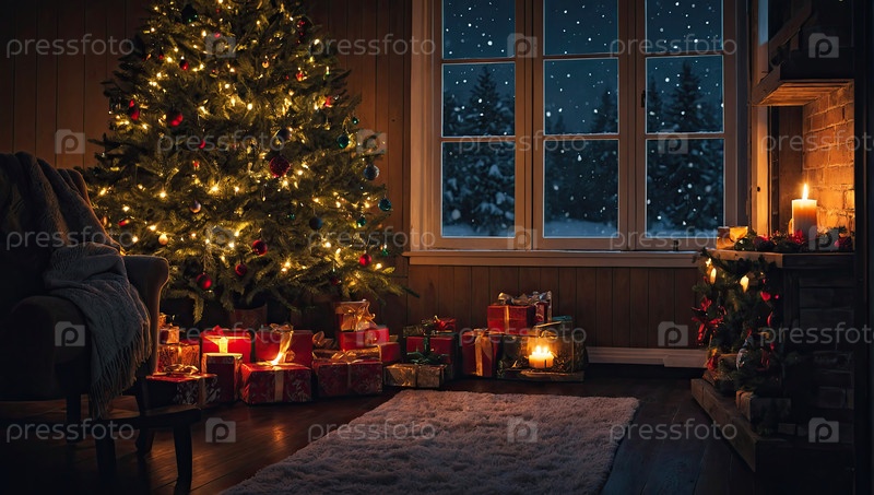 Уютное внутреннее окно гостиной с рождественским декором и теплыми световыми гирляндами и свечами. отпразднуйте Рождество и Новый год, елку, боке. созданный ИИ