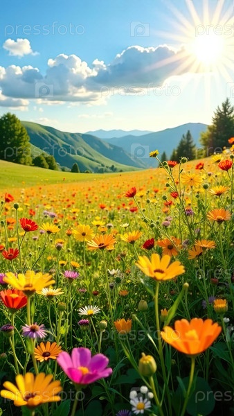 Зеленая луга с дикими цветами, голубое небо, солнечный свет, спокойный природный фон для поздравительных открыток или плакатов