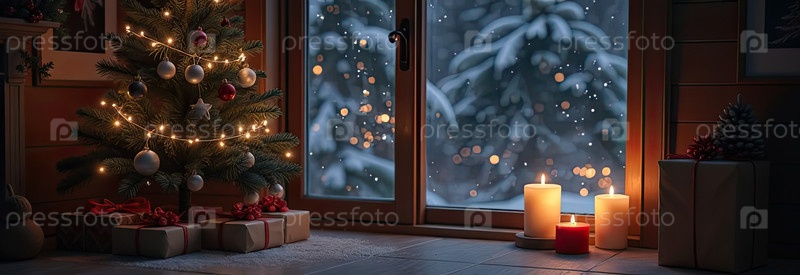 Внутреннее уютное окно с рождественским декором и теплыми световыми гирляндами и свечами - внутренний вид зимой и снегом со спасом для текста. Отпразднуйте Рождество и Новый год, елку, боке. ИИ генерируется