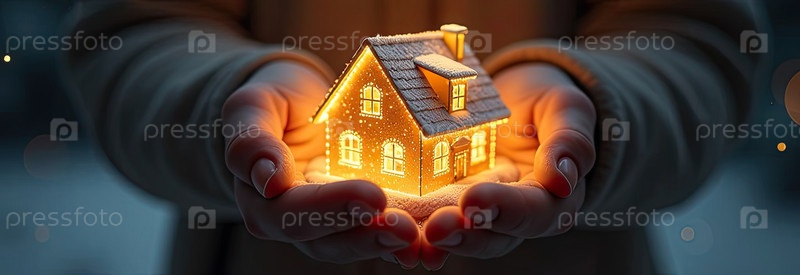 Золото светящийся символ уютного дома В ладонях рук с золотым блеском. Недвижимость, риэлтор, ипотека, страхование, бронирование, изоляция, мечта о собственном доме. ИИ генерируется