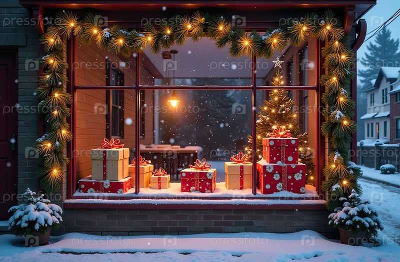 Наружное уютное окно с рождественским декором и теплым светом внутри - вид снаружи дома. отпразднуйте Рождество и Новый год, елку, боке, снег. созданный ИИ