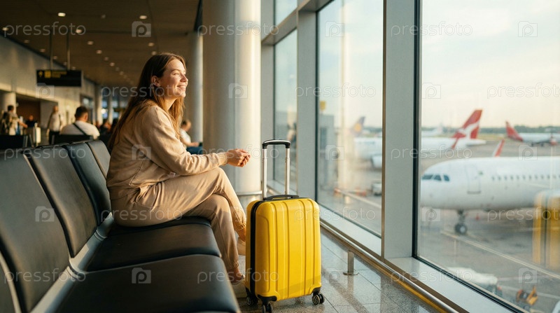 Женщина с чемоданом сидит у окна аэропорта в ожидании рейса, смотрит наружу, ожидание путешествия, отпускное настроение, современная сцена терминала