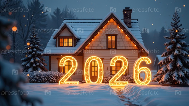 Прозрачное золото светящиеся числа 2026 под крышей дома на снежном фоне Нового года с золотым блеском