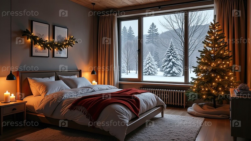 Уютная спальня с кроватью у окна с рождественским декором и елкой, теплыми гирляндами света и свечами - вид изнутри зимой и снегом. Отпразднуйте Рождество и Новый год, рождественское настроение. ИИ генерируется