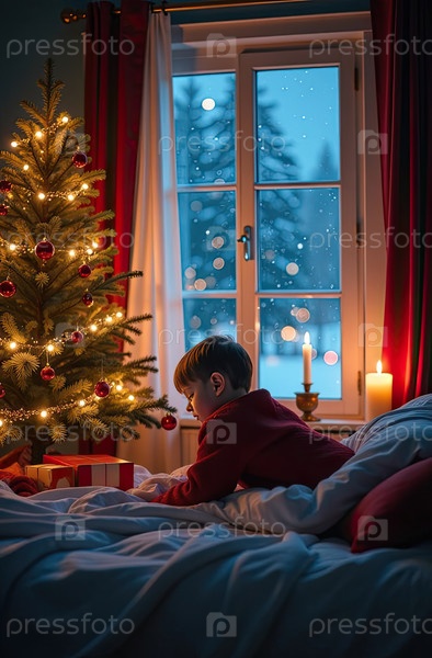 Ребенок спит в кровати в уютной спальне с рождественской елкой и теплыми гирляндами света и свечами - вид из окна зимой и снегом