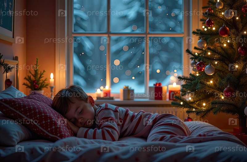 Ребенок спит в кровати в уютной спальне с рождественской елкой и теплыми гирляндами света и свечами - вид из окна зимой и снегом
