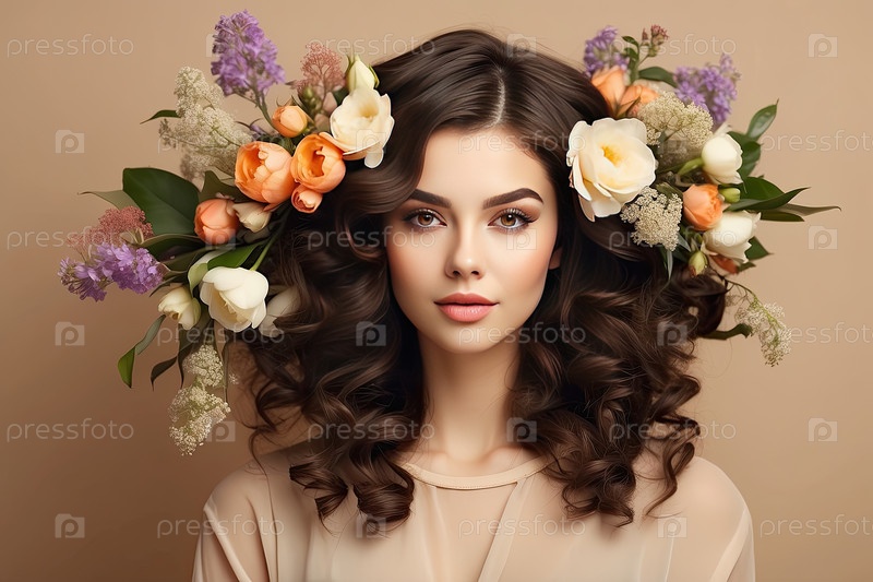 Брюнетка с объемными волосами и оранжево-розовыми цветками, бежевый фон, весенний цветочный портрет, женственность, элегантность, 8 марта, женский день