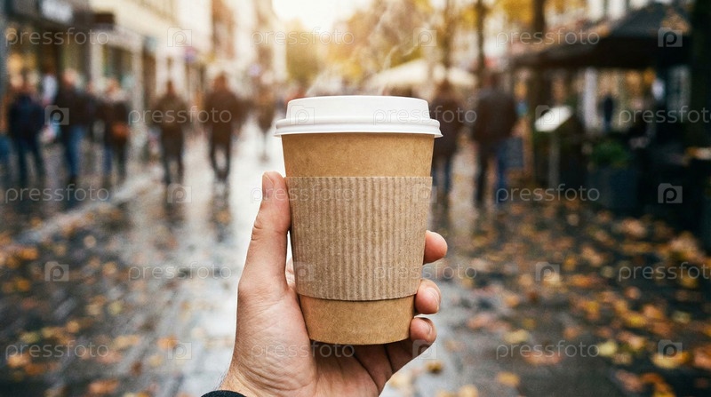 Бумажная чашка горячего кофе в руке на городской улице, выпивка с кофейней, урбанистический фон, утренняя прогулка, тепло осенью, напиток для образа жизни