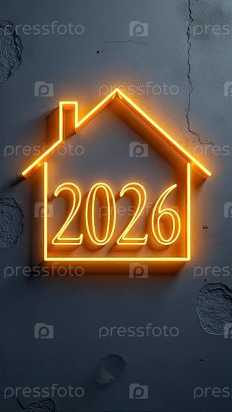 Прозрачное золото светящиеся номера 2026 под крышей дома на сером бетонном фоне с золотым блеском. недвижимость, риэлтор, ипотека, страхование, бронирование. ИИ генерируется