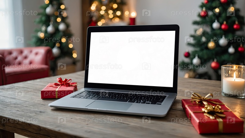Ноутбук с белым экраном макет на столе в уютном домашнем офисе рождественского декора в стиле лофт