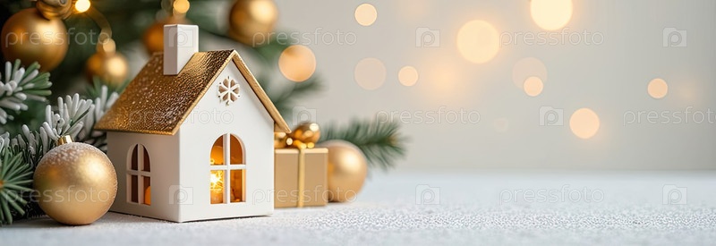 Золото-белый символический дом и подарочная коробка под рождественской елкой на столе Рождественский фон с золотым блестком на поздравительной карточке
