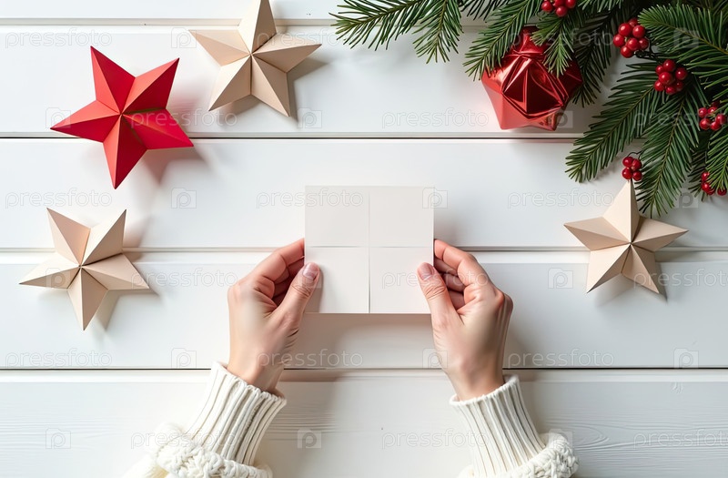 DIY оригами-бумага своими руками на Рождество и Новый год, с рождественским декором на белом столе из доски, натуральный декор. Праздничное настроение. Flatlay, background, copy space. AI generated