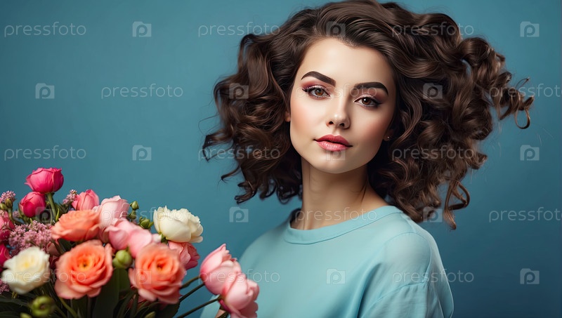 Брюнетка с закрученными коричневыми волосами и розовым букетом, синий фон, весенний цветочный портрет, женственность, нежность, романтика, 8 марта, женский день