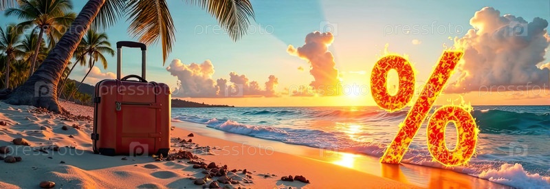 Огненный горящий знак процент И красный чемодан на берегу моря с тропическими пальмами в свете солнца, океанический закат на заднем плане. Горячая летняя распродажа и скидки, горячий баннер тура, листовка. AI генерируется