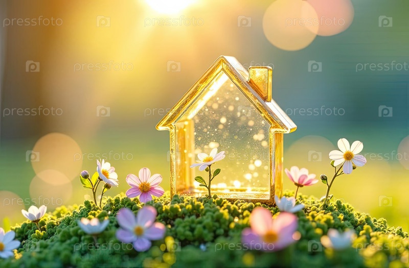 Крошечный эко-дом теплица в солнечных лучах, с весенними цветами на весеннем пастельном фоне. недвижимость, дача, летний дом, ипотека, страхование, бронирование, строительство, изоляция. ИИ генерируется