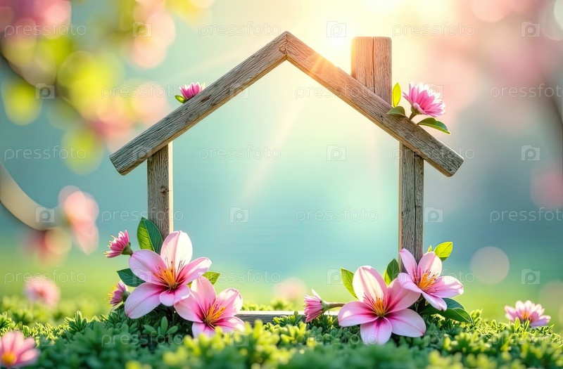 Домашняя декоративная рама в солнечных лучах, украшенная весенними пастельными цветами на весенне-синем фоне. недвижимость, риэлтор, ипотека, страхование, бронирование, строительство, изоляция. AI generated