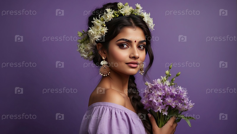 Индийская женщина с волнистыми волосами и фиолетовой цветочной короной, фиолетовый фон, портрет весенней красоты, женственность, цветочный фестиваль, 8 марта, женский день