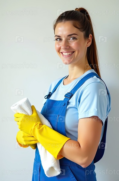 Портрет молодой женщины в синем фартуке и желтых резиновых перчатках с тряпкой в руке у окна против белой стены, служба очистки окон, уборка дома