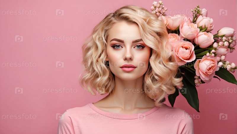 Блондинка с пастельно-розовыми цветками, творческий портрет весенней красоты на розовом фоне, женственный стиль, празднование цветков, 8 марта, женский день