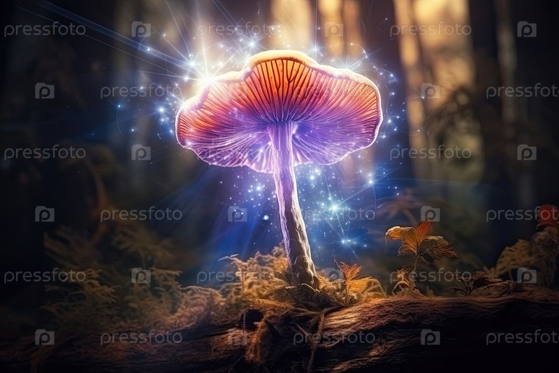 Один зачарованный гриб, высвобождающий галлюциногенные споры, псилоцибин визуальная фантазия, символ магических грибов и психоактивной зависимости