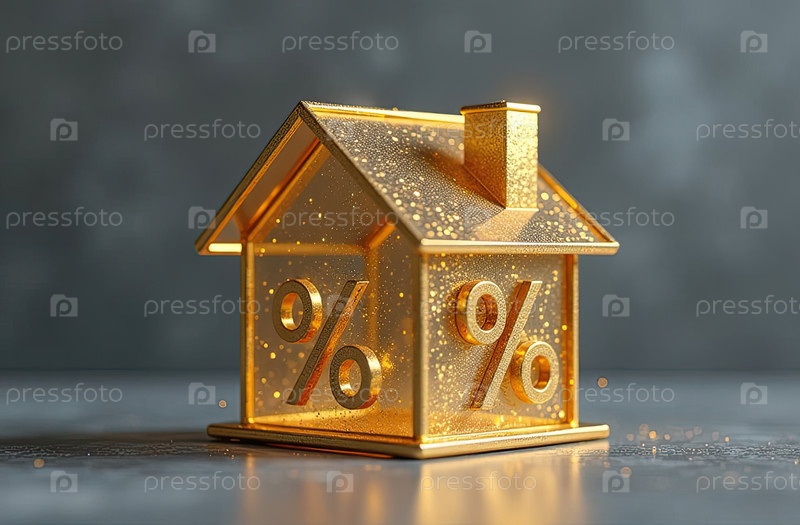 Золотой светящийся символ процент в доме на сером бетонном фоне с золотым блеском. строительство жилья, скидка, купон, покупка, продажа, риэлторская деятельность, ипотека, страхование, бронирование. AI generated