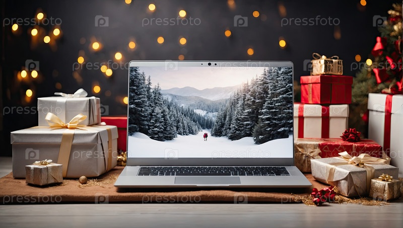 Ноутбук с рождественскими обоями на столе в офисе в торговом центре Рождественский декор с сумками, торговыми пакетами, посылками, Черной пятницей, Новым годом