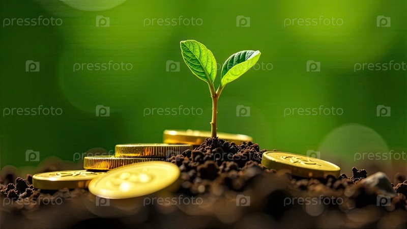Молодой зеленый побег растет из земли и золотые монеты вблизи на зеленом фоне. Экономика, финансы, экология, стартап. ИИ генерируется