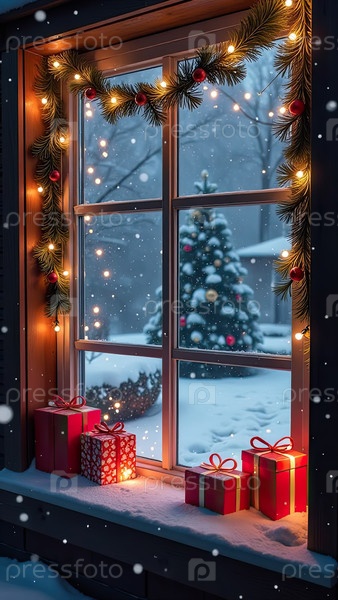 Внутреннее уютное окно с рождественским декором и теплым светом - вид изнутри зимой и снегом. отпразднуйте Рождество и Новый год, елку, боке, снег. ИИ генерируется