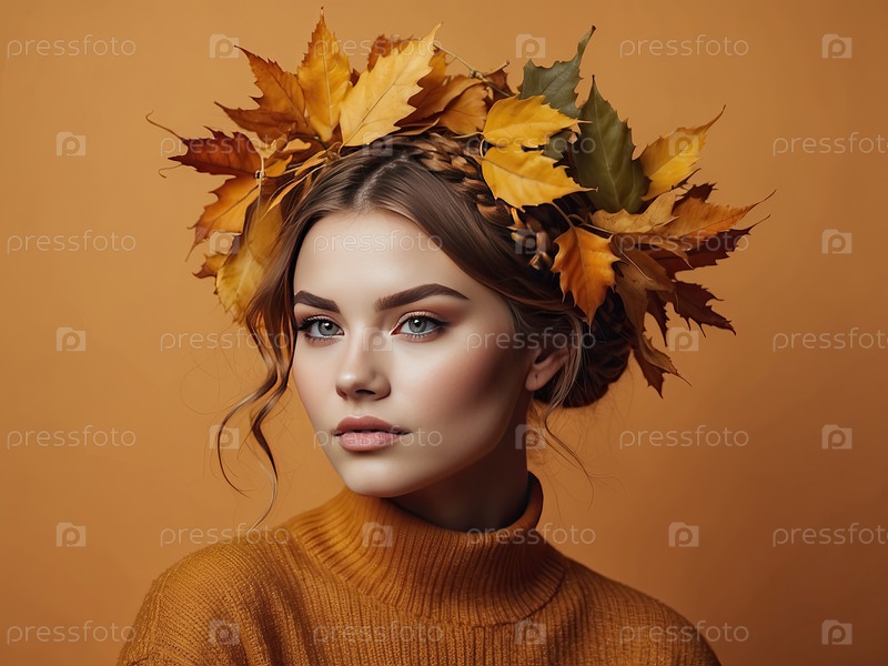 Белая женщина с голубыми волосами и кленовыми листьями в волосах, портрет осенней красоты, уютный сезон, настроение осени