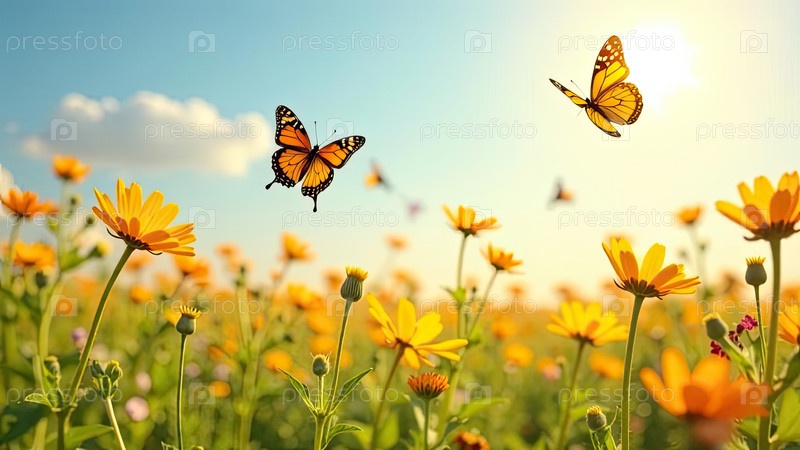 Весенний луг с бабочками, синее небо, широкий цветущий природный фон, воздушный и яркий для баннеров