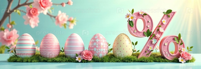 Процентный знак и пасхальные яйца в солнечных лучах, украшены весенними пастельными цветами