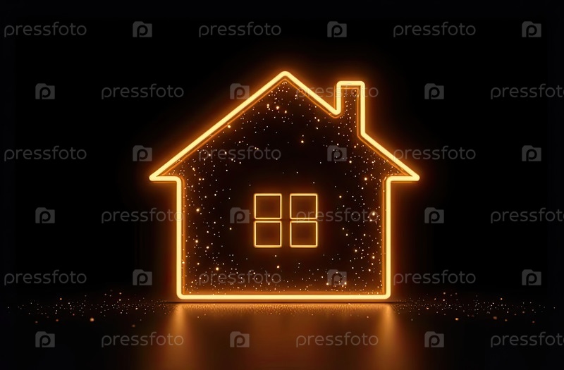 Прозрачное золото светящийся символ дома на черном фоне с золотым блеском. недвижимость, риэлтор, ипотека, страхование, бронирование, строительство, изоляция, отопление. AI generated