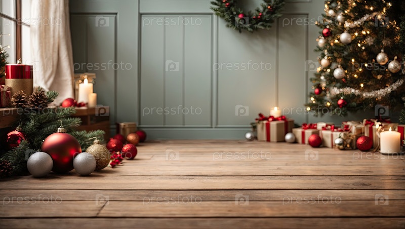 Пустой деревянный пол в нейтральных тонах для отображения продукции со стеной во внутренней части комнаты в зеленых и коричневых тонах, с рождественским декором. Копирование пространства, Рождество и Новый год. ИИ генерируется