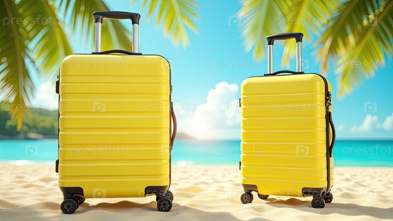 Желтый чемодан на тропическом пляже - это поездка к морю в теплый летний климат, туристическая экскурсия