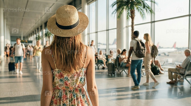 Обратный взгляд на женщину в летнем костюме и шляпе в аэропорту, ожидающую рейса с чемоданом, путешествие, атмосферу отпуска, настроение предвкушения