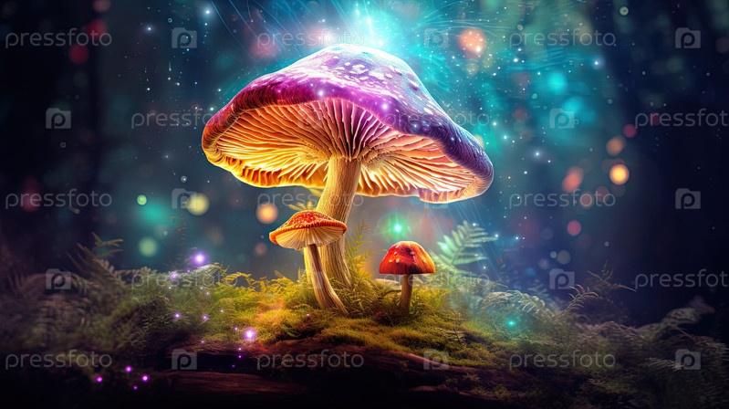Большое семейство светящихся псилоцибинных грибов, синий свет, пылающий фэнтезийный лес, галлюциногенные споры, поездка, мир наркотиков, риск зависимости