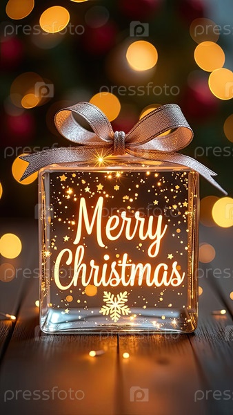 Золотая Рождественская надпись на прозрачной светящейся коробке для подарков на праздничном фоне с гирляндами боке с пространством для текста. Поздравления, открытки. ИИ генерируется