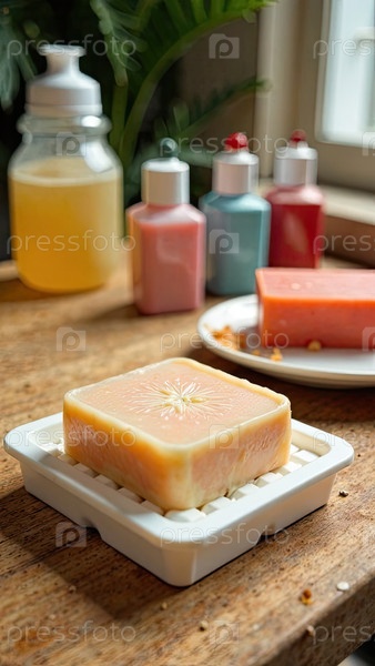 Ручно сделанный натуральный эко-сапун на деревянном столе с бутылками с ароматизатором, красителем и мыльной основой. Подарок, подарок, ремесленная домашняя гигиена. Хоби изготовление мыла, дома сделано. ИИ генерируется;