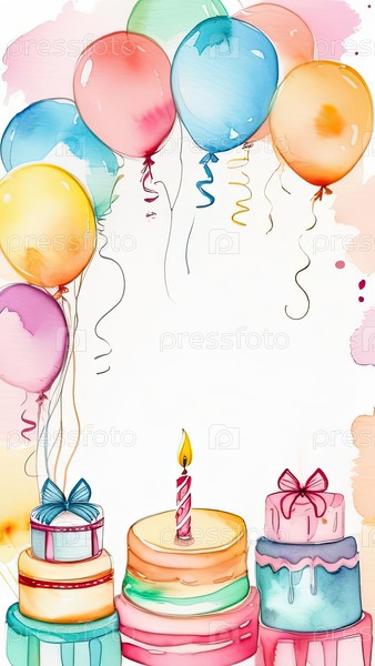 Вертикальный пастельный шарик и тортовая оболочка, рамка акварели, открытка для вечеринки на поздравление с днем рождения, свободное пространство для пожеланий