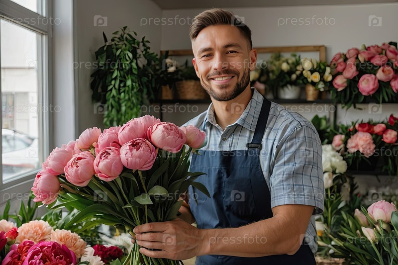 Европейский цветочник, улыбающийся и преподносящий букет пионьев, цветочный магазин готовит подарки на свадьбы и дни рождения