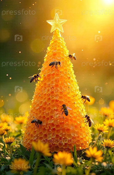 Мед в сосудах в форме конуса рождественской елки с пчелами на летнем поле под солнечным светом.Пчеловодство, Рождество, Новый год.Искусственный интеллект создан