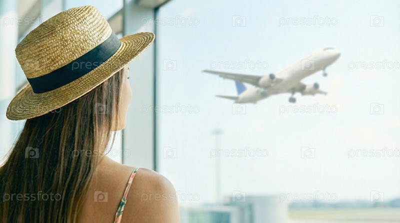 Задний вид женщины в шляпе, наблюдающей за самолетом через окно аэропорта, путешественное вдохновение, ожидание поездки, отпускная поездка, настроение аэропорта