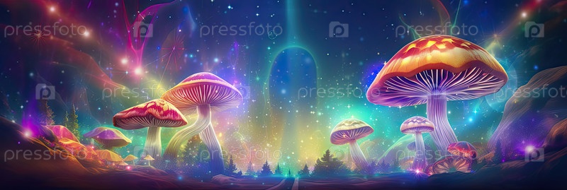 Два фиолетовых волшебных гриба, светящиеся в синей фантазии, споры псилоцибина, психоактивное поле, галлюцинационная поездка, кластер, риск наркомании