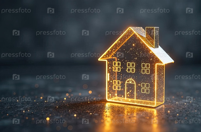 Прозрачное золото светящийся символ дома на сером бетонном фоне с золотым блеском. недвижимость, риэлтор, ипотека, страхование, бронирование, строительство, изоляция, отопление. ИИ генерируется
