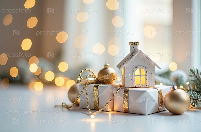 Золото-белый символический дом и подарочная коробка под рождественской елкой на столе Рождественский фон с золотым блестком на поздравительной карточке